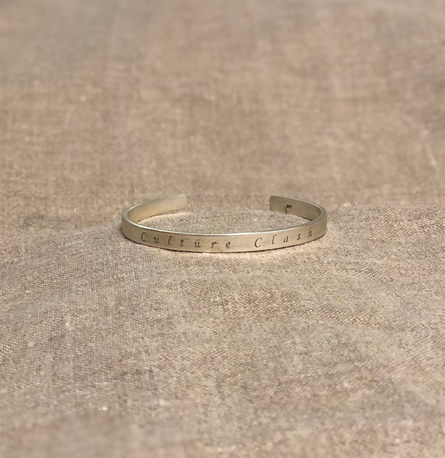 Open cuff in Sterling Silver with 2 lapis lazuli crystals. Engraved "Culture Clash" bracelet for men.
