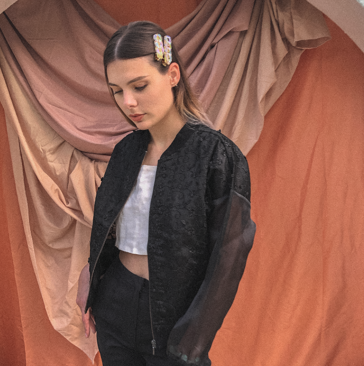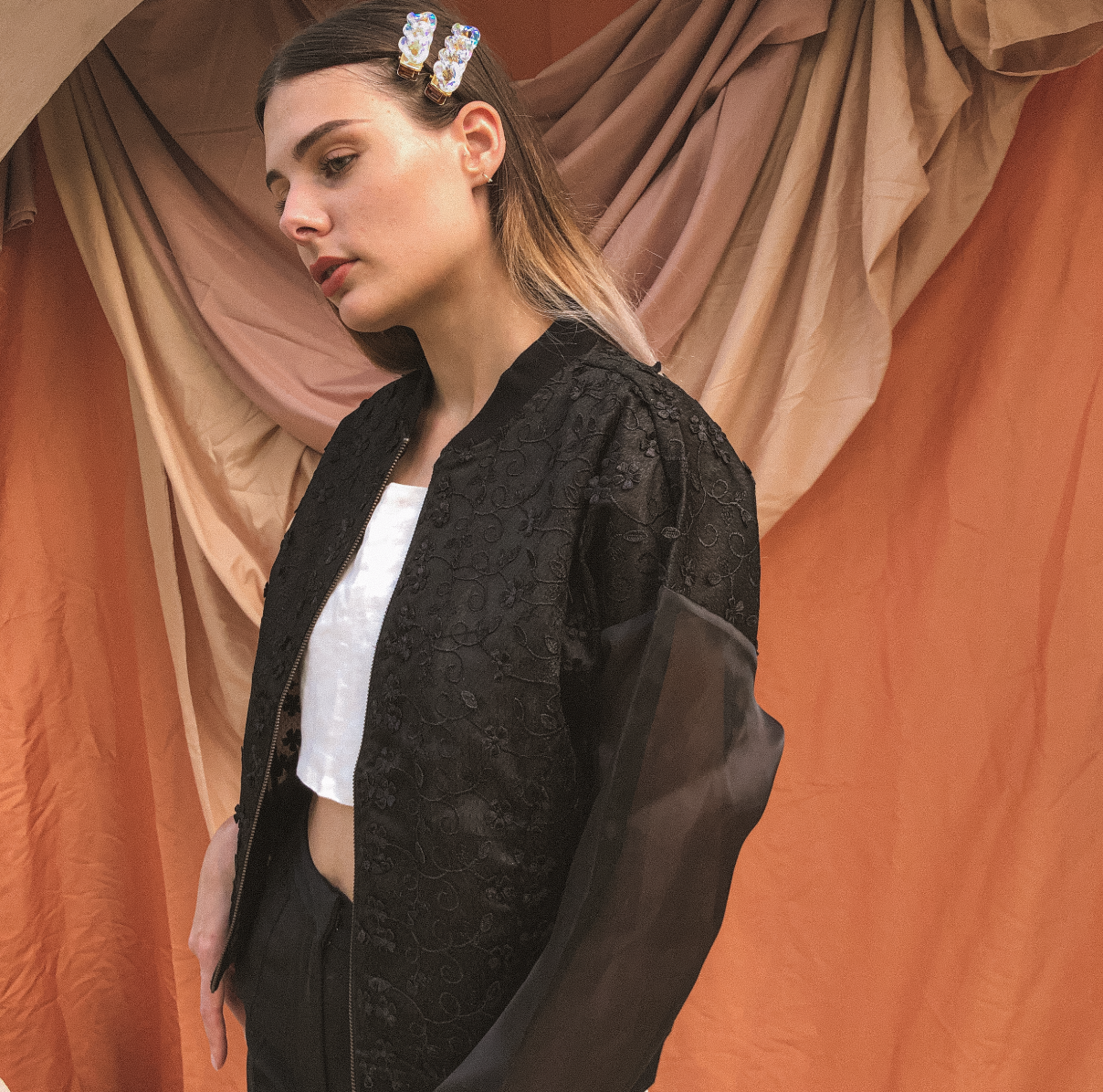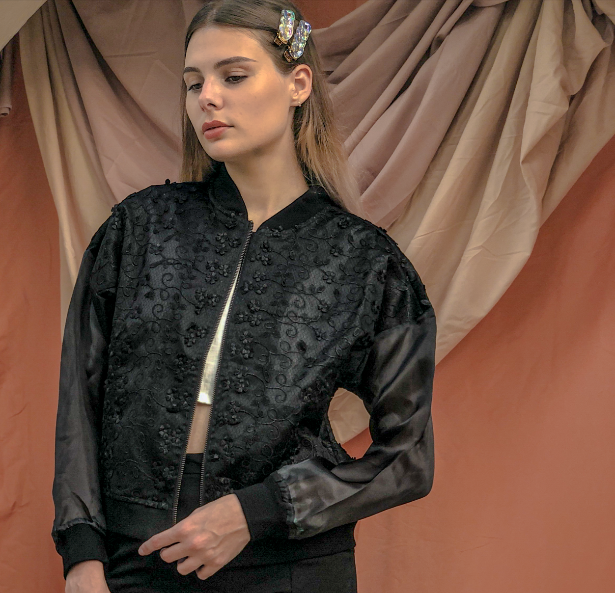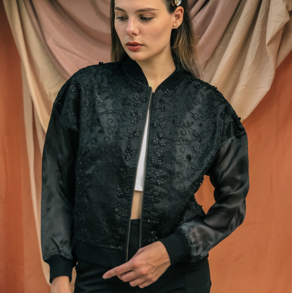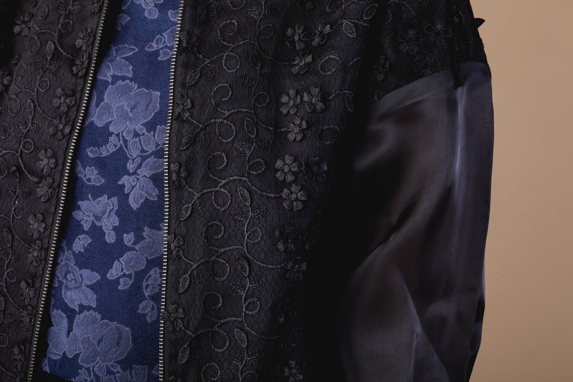 Embroidered Floral front and back panels, slightly see-through sleeves, cotton collar and cuffs.