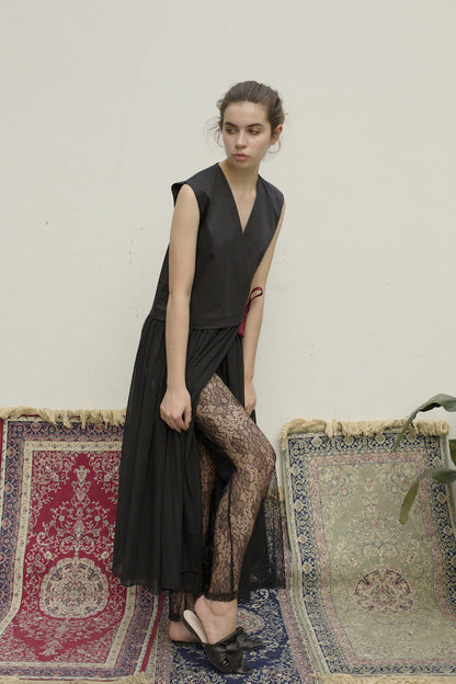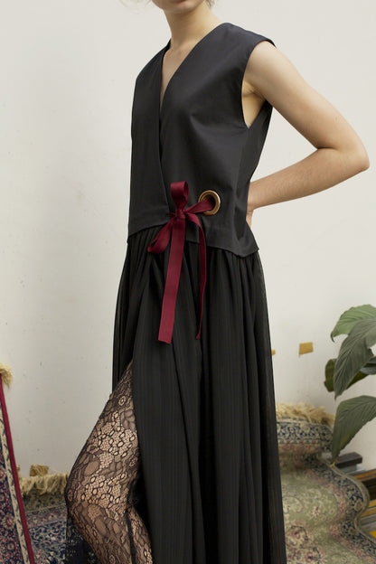 A loose-fitted tailored maxi-length vest made with structured suiting top panels and silk-cotton chiffon drapes at the bottom, that can be worn as a dress.