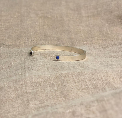 Open cuff in Sterling Silver with 2 lapis lazuli crystals. Engraved "Culture Clash" bracelet for men.