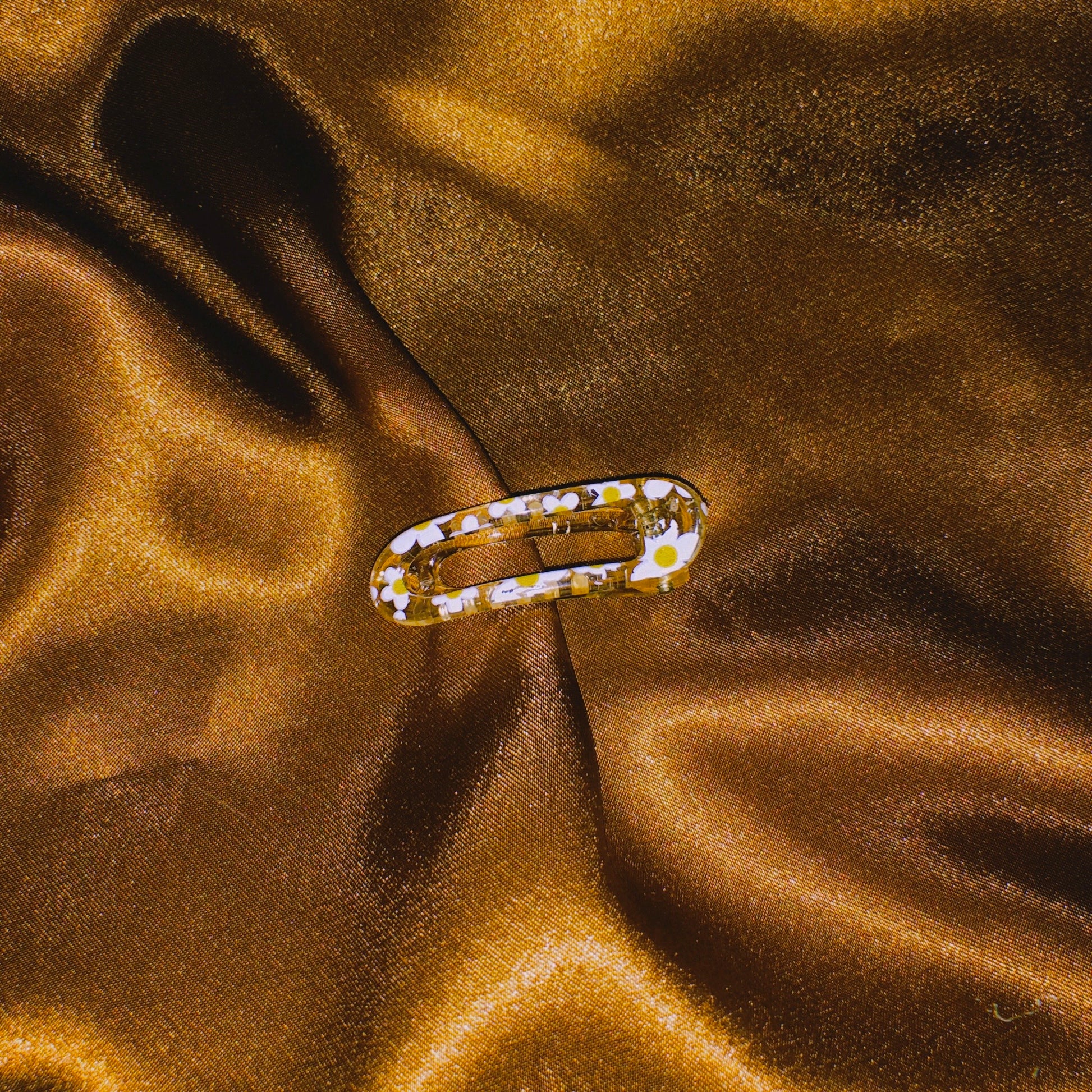 Whimsical clear mini hairslides with daisy print, 90s summer style.
