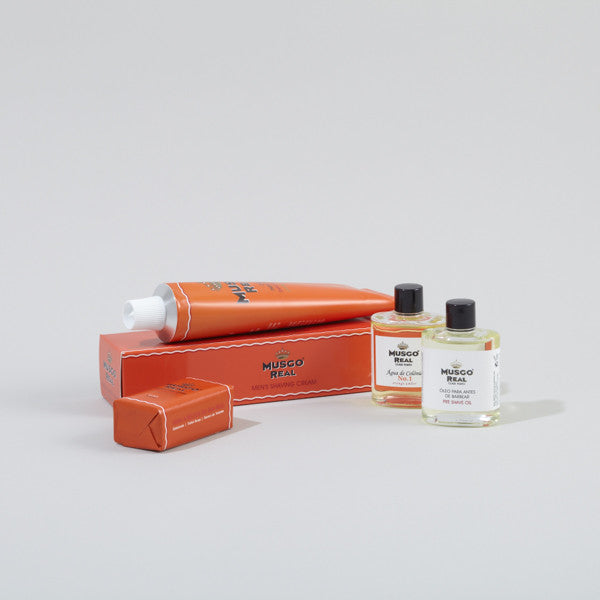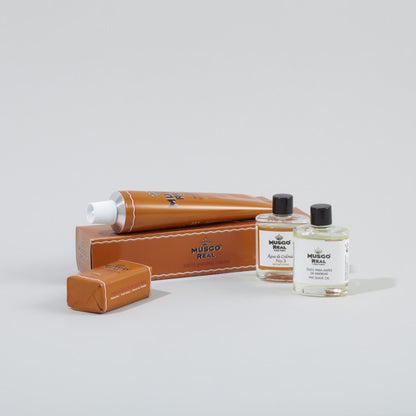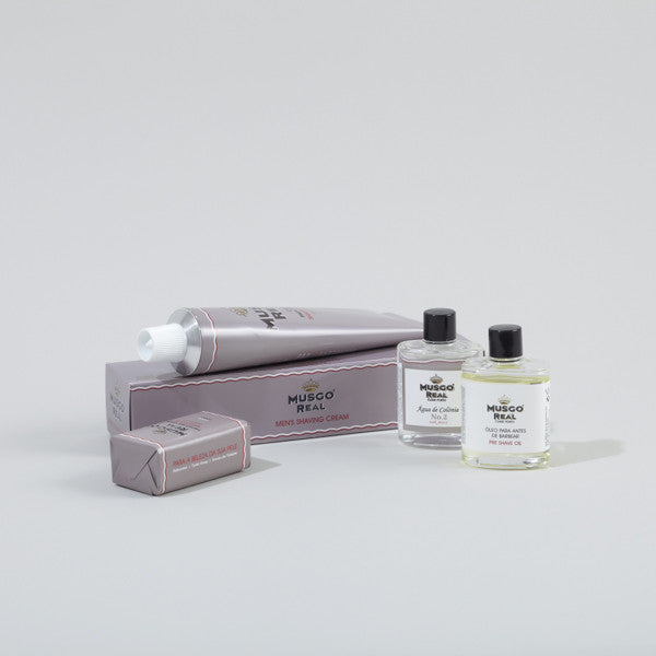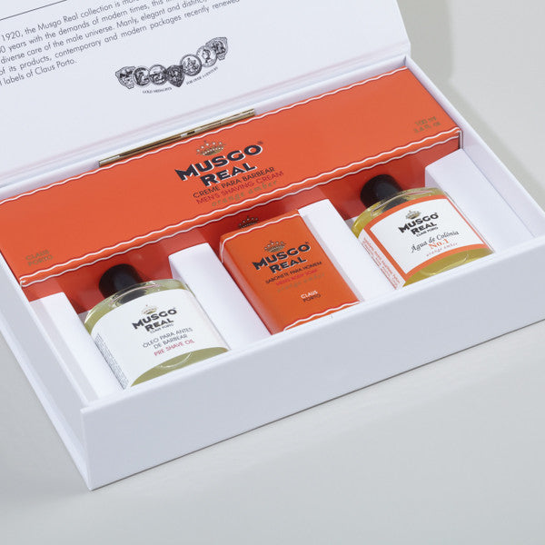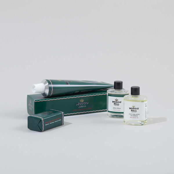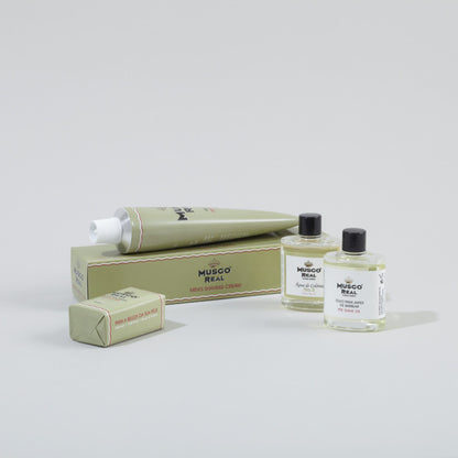 The Musgo Real White Gift Box come with a shaving cream, mini preshave oil, mini soap and mini cologne. Items comes in mini sizes so you can bring along for your travels or slipping slip in to your pockets.