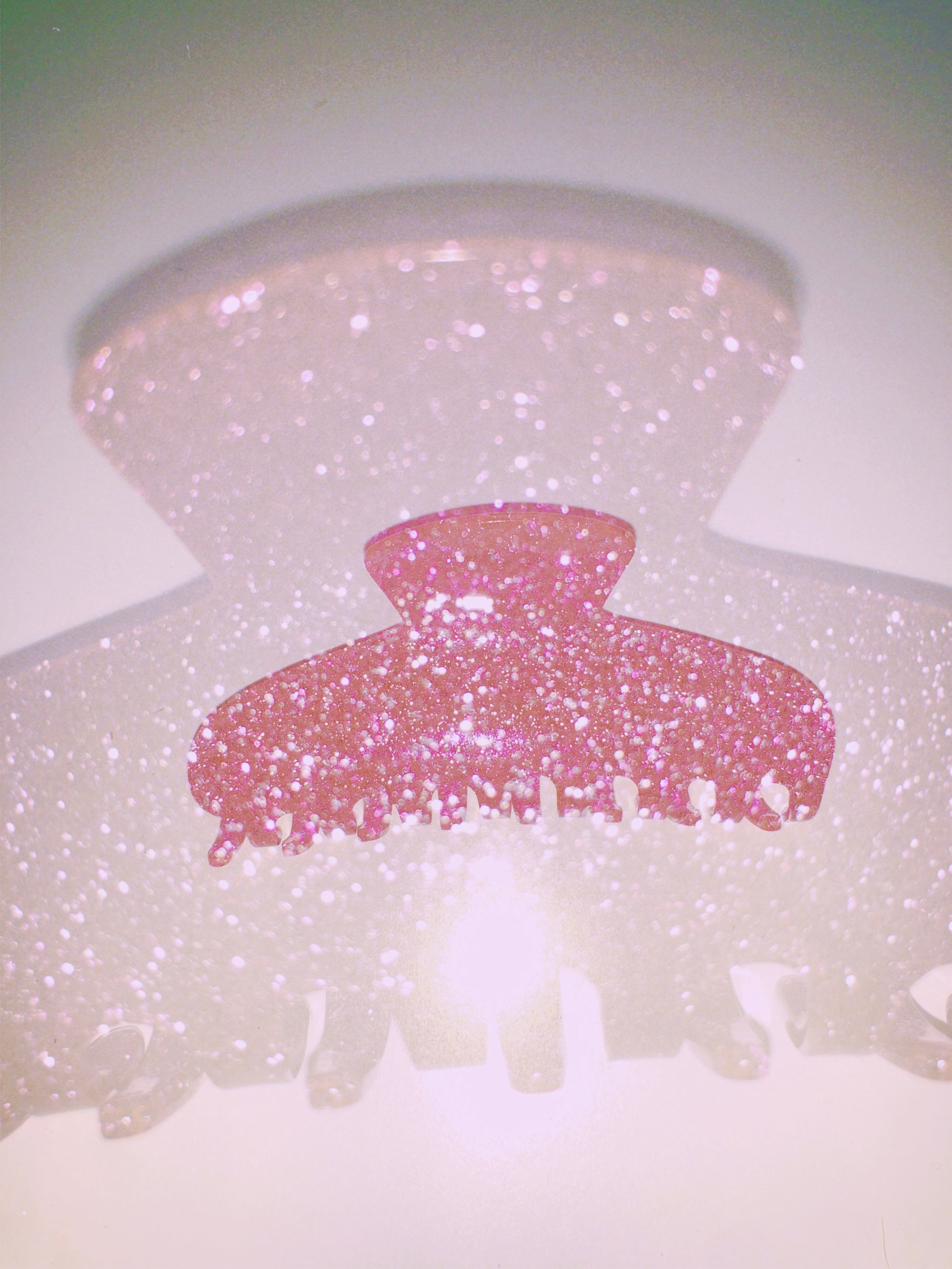 A super cute hair claw strong enough to hold up longer tresses. The Ivy Claw comes in green & silver glitter and the Regina Claw comes in pink & silver glitter made with biodegradable acetate. Available in Ivy and Regina.