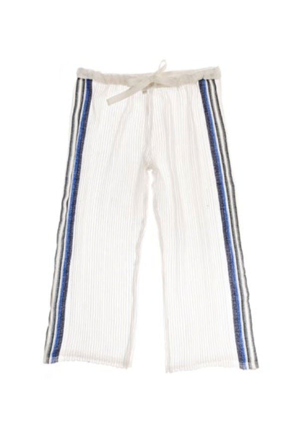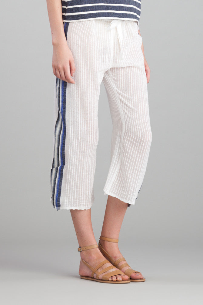 Traditional hand spinning and weaving using natural cotton, this sheer cotton gauze Rucha Cropped Pants are detailed with multicoloured ornate stripe and vivid color.