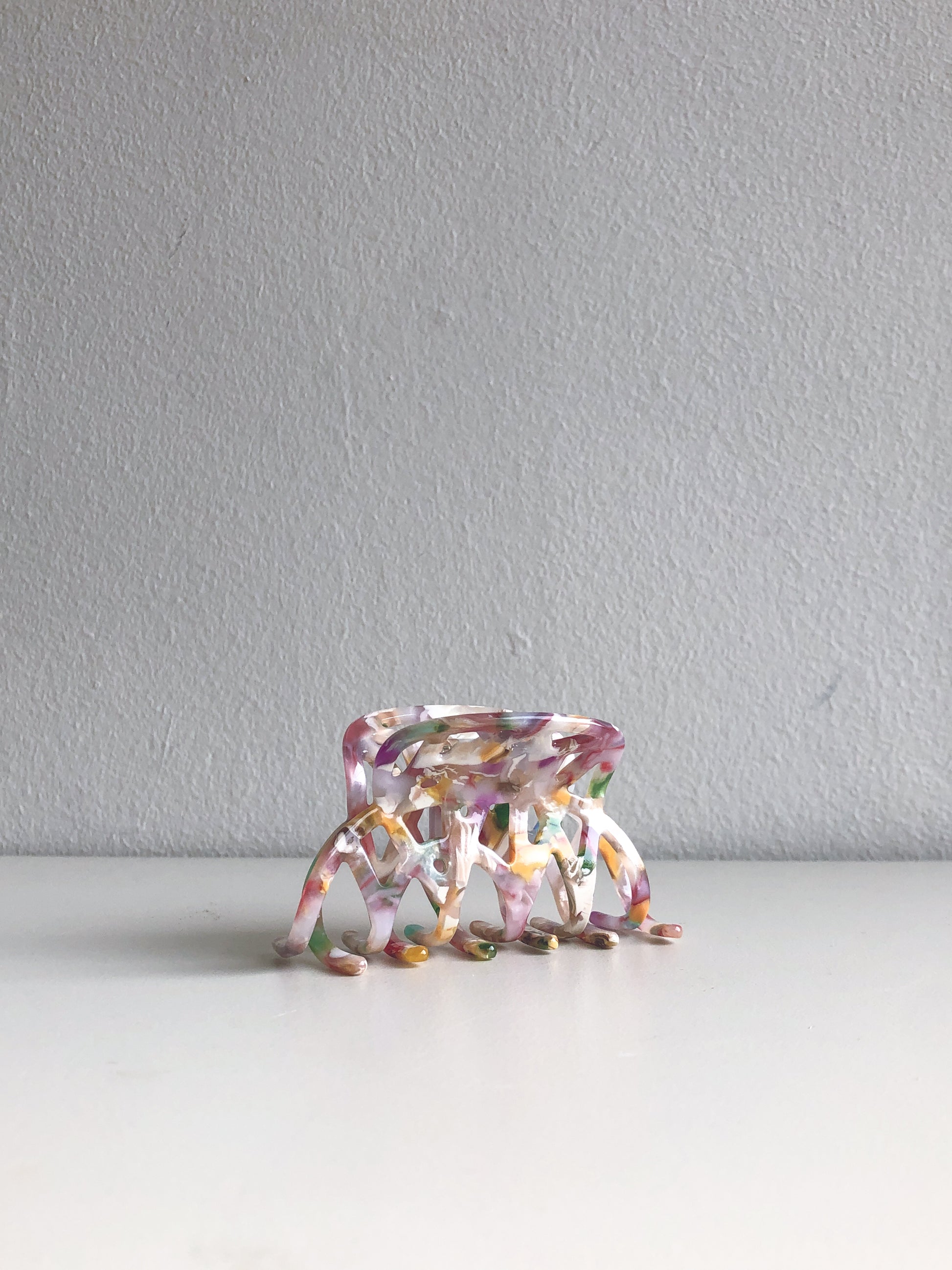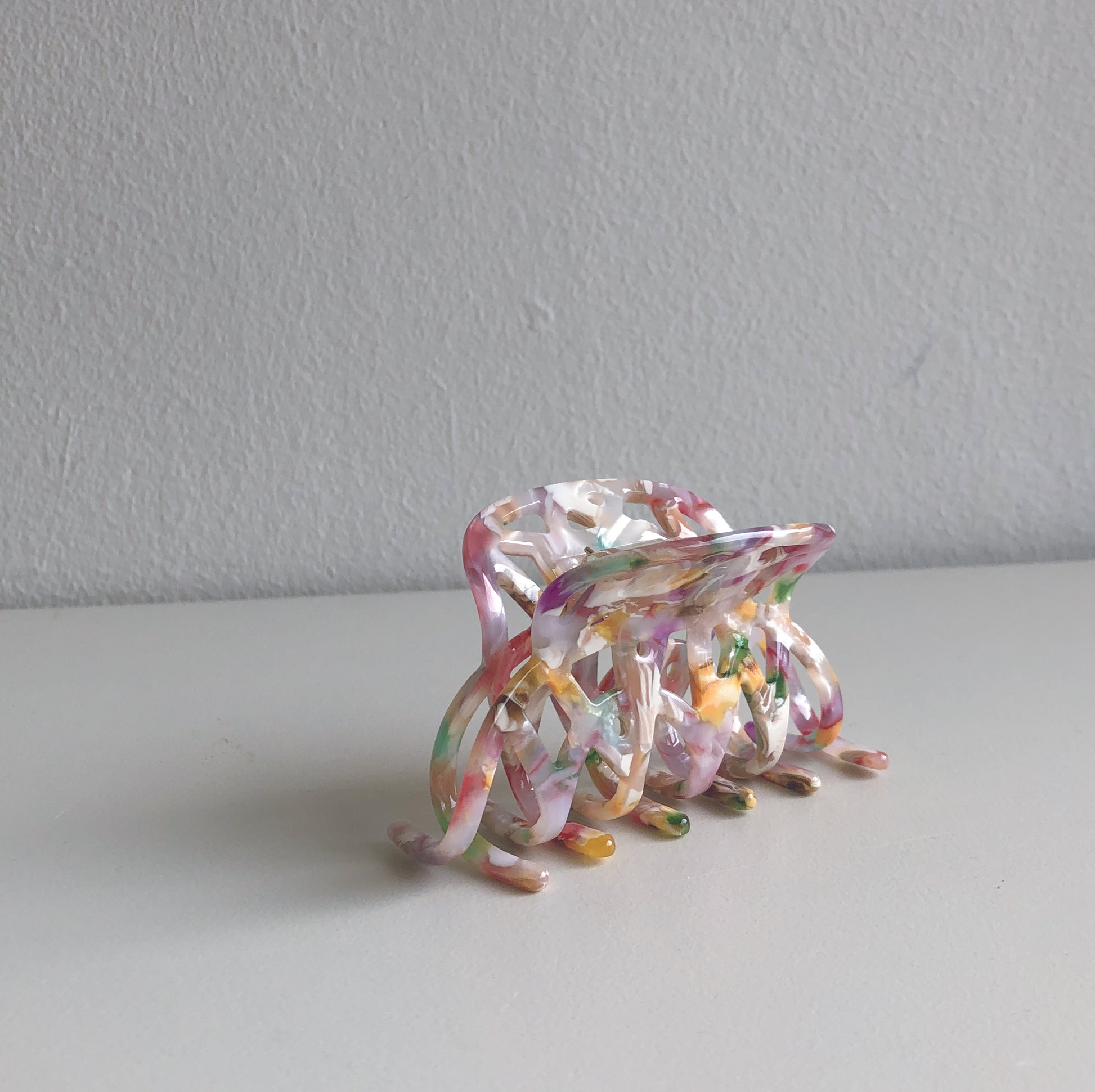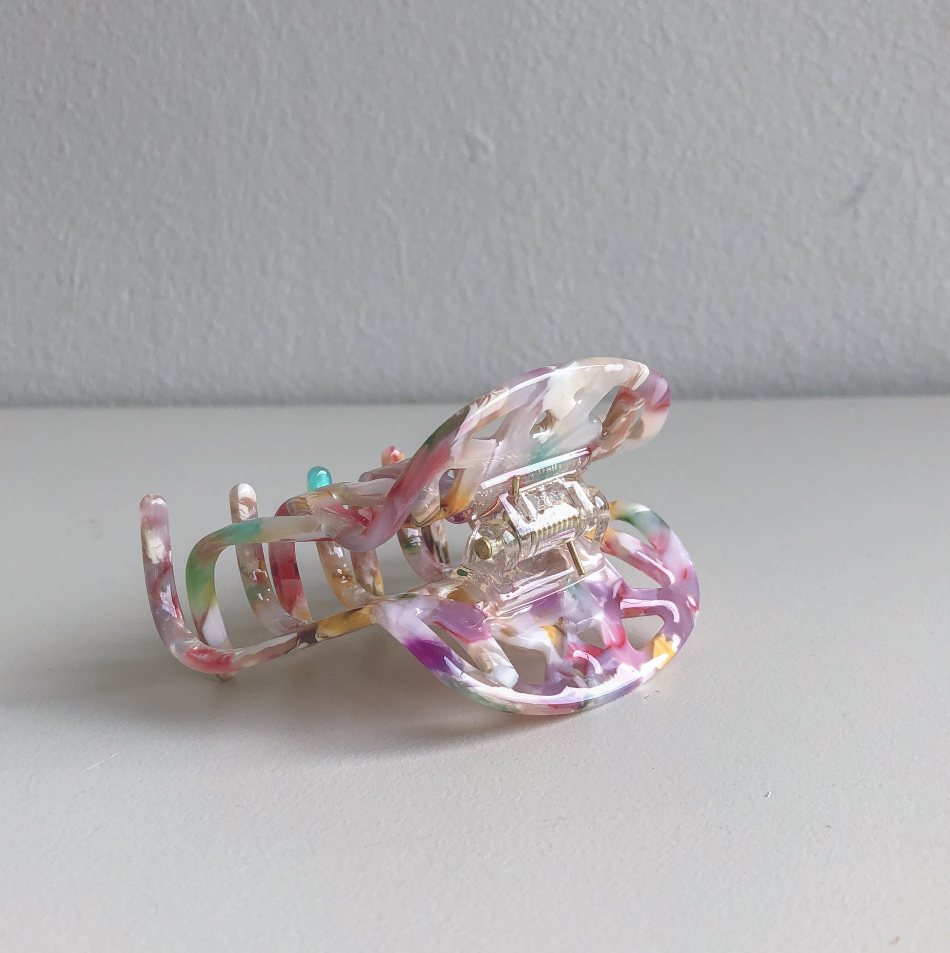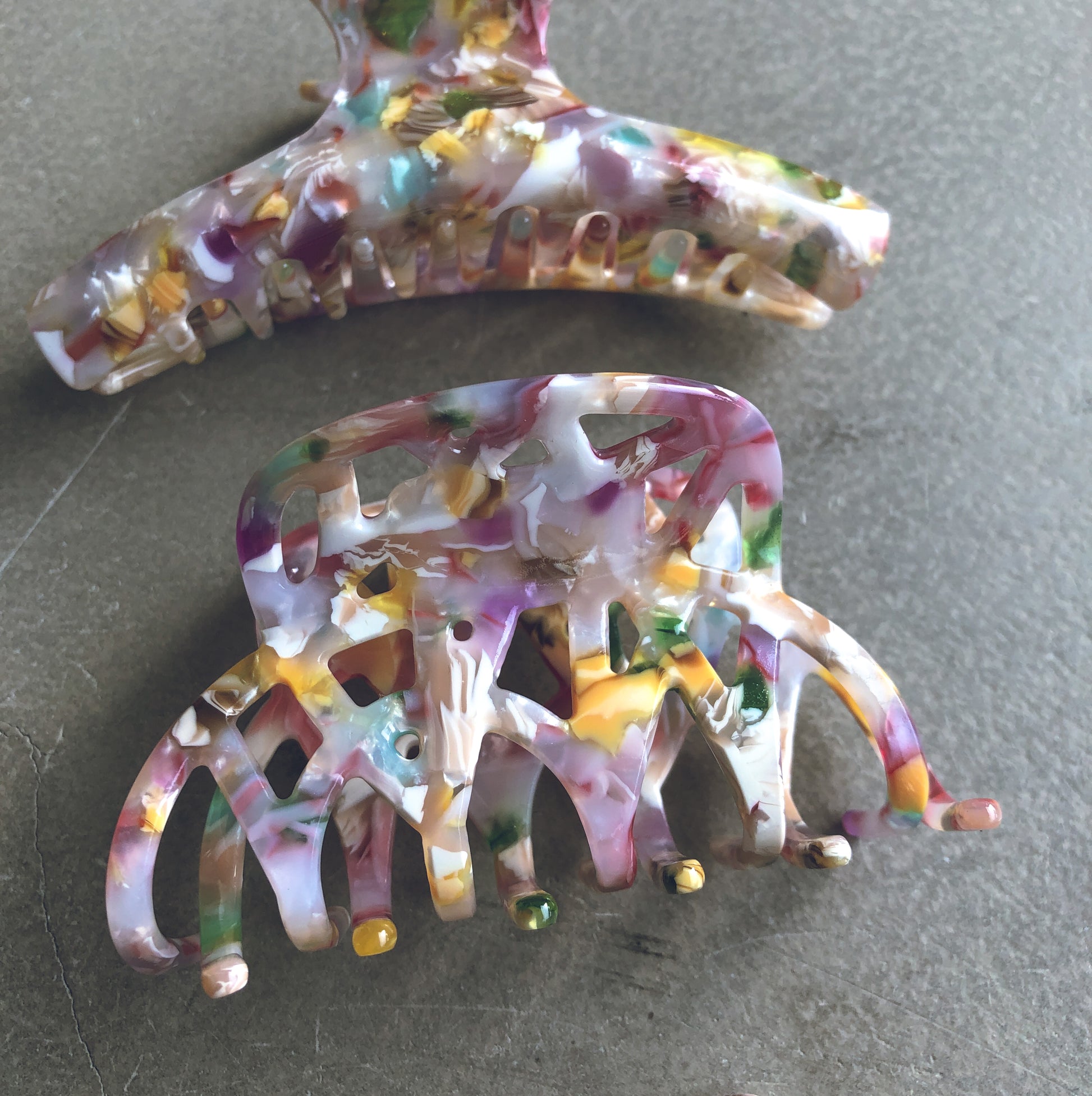 The Arabella Hair Claws come in a beautiful shell finish with a smattering of pink, white, red and green, that are a great accent in any hairstyle and are perfect for a pop of colour in an half up-do.