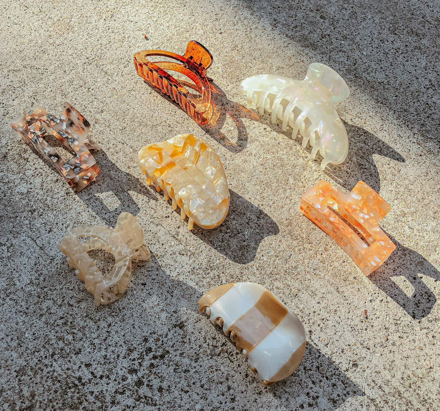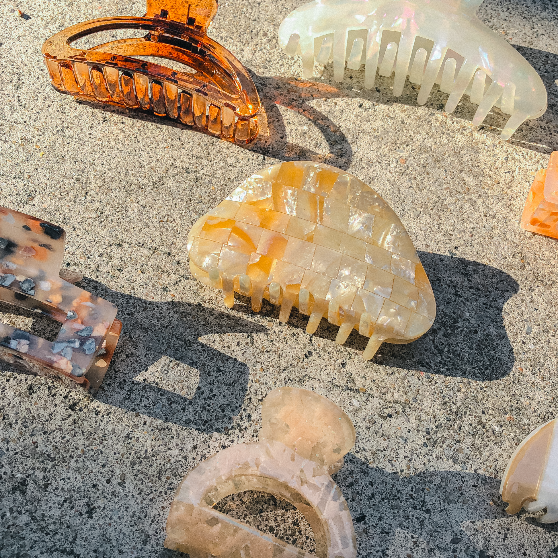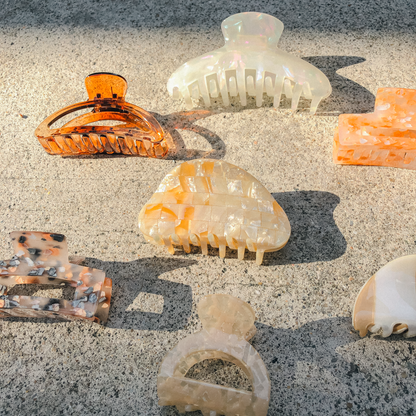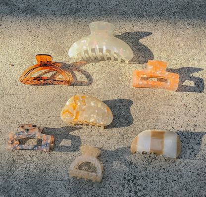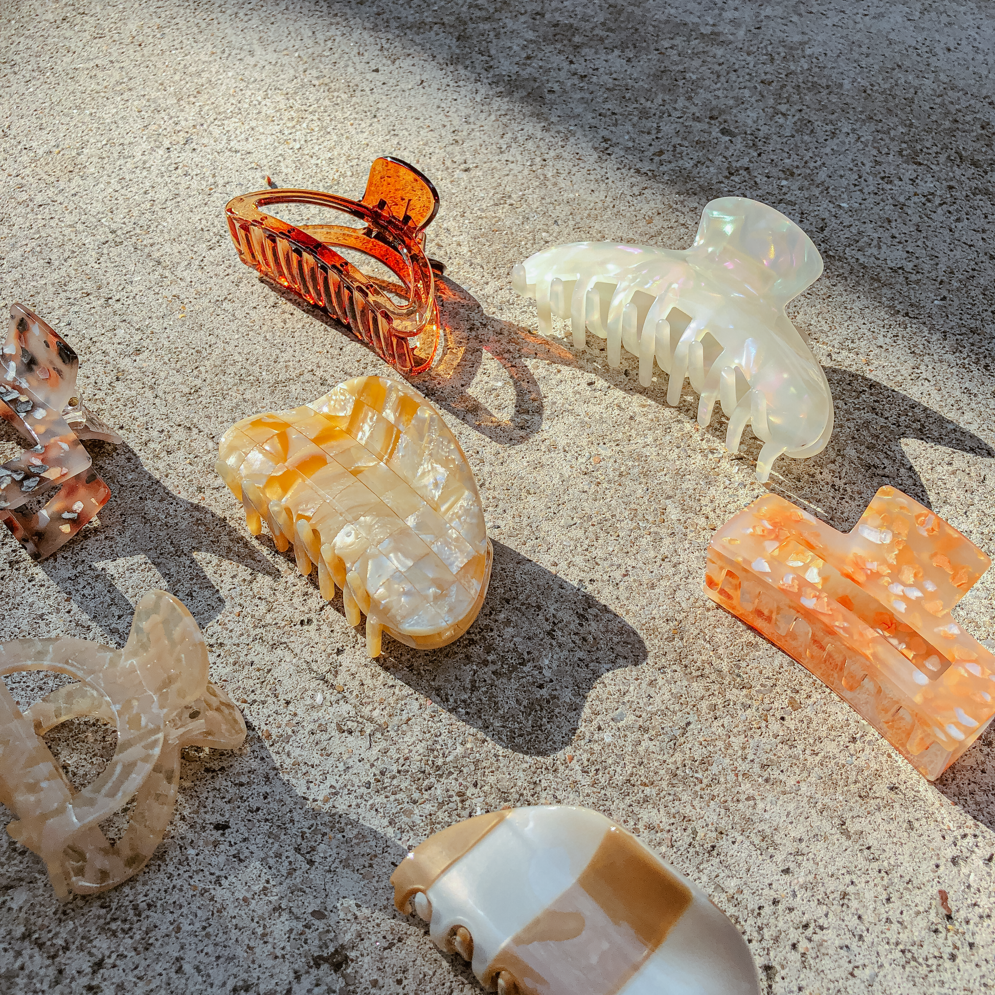 Made with biodegradable acetate, this collection of neutral toned hair claws come in a variety of finishes. Each hairclaw is handmade, patterns & measurements will slightly vary according to batch.